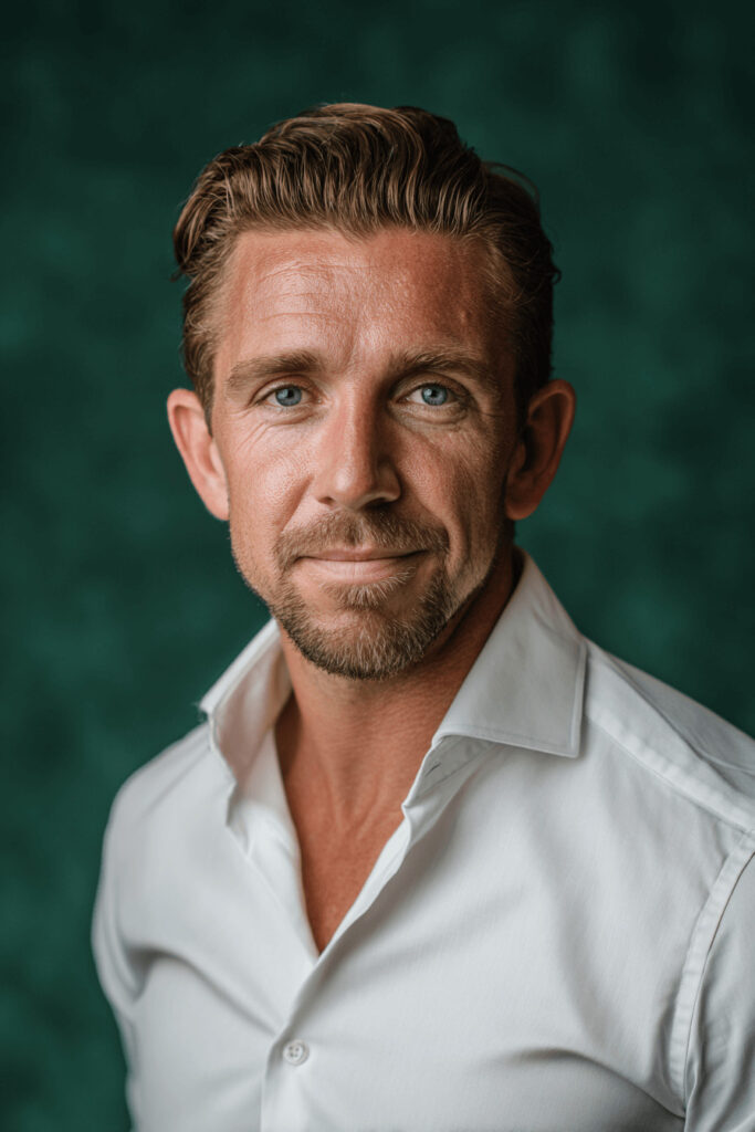 professional portrait, business person, confident expression, white shirt, simple green background, blurred background, studio lighting --ar 2:3 --v 7