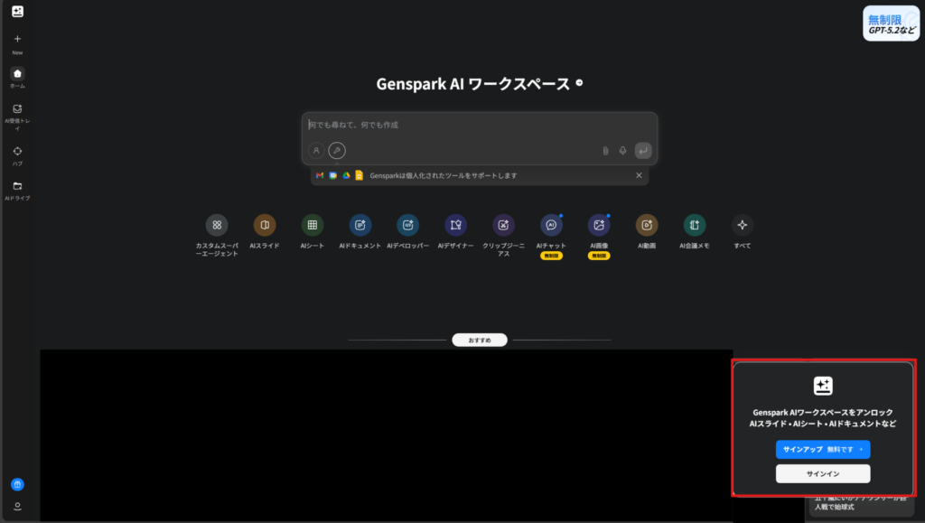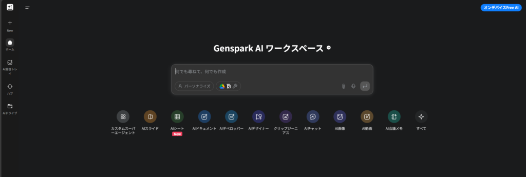 トップページに自動遷移したことを確認し、ログイン完了です。画面中央のテキストボックスや、画面下部の使用したAIエージェントを選択することで、Gensparkを利用することができます。
