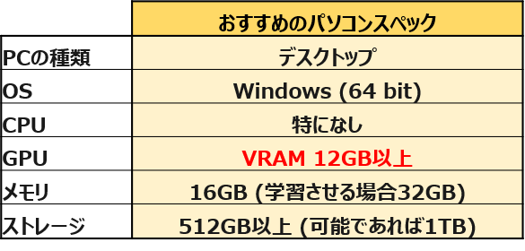 - ローカル環境を構築するためには、ある程度のPCスペックが必要であり、特にGPUはVRAM 12GB以上がおすすめ。