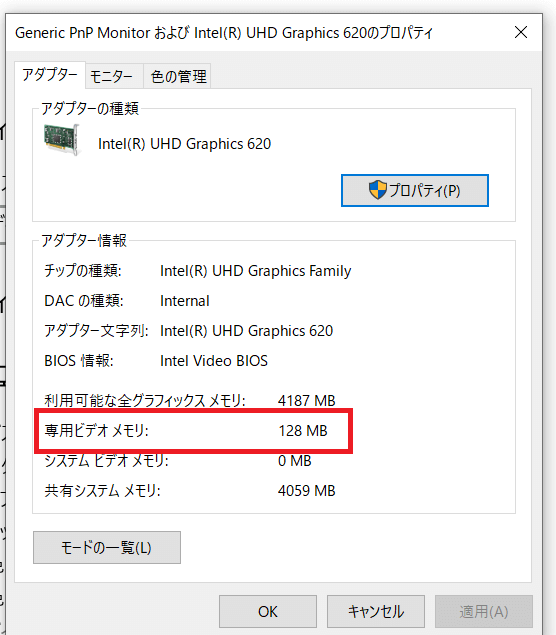「ディスプレイの詳細設定」をクリックしたら、「ディスプレイ1のアダプタープロパティを表示します」とある箇所をクリックし、GPUのスペックを確認します。