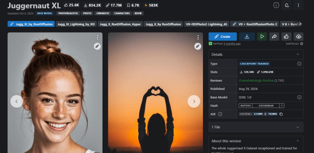 Juggernaut XLは2023年8月にリリースされて以来、数々のアップデートを重ねてきました。最新バージョンでは「Lightning」という高速版も登場し、より短時間での画像生成が可能になっています。