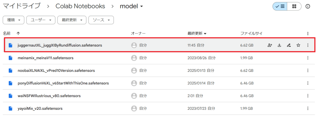 これで、Google ColabにJuggernaut XLのモデルをアップロードできました。