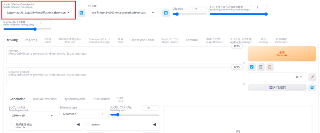 ここからは、ダウンロードしJuggernaut XLのモデルをどのように使用するか解説していきます。