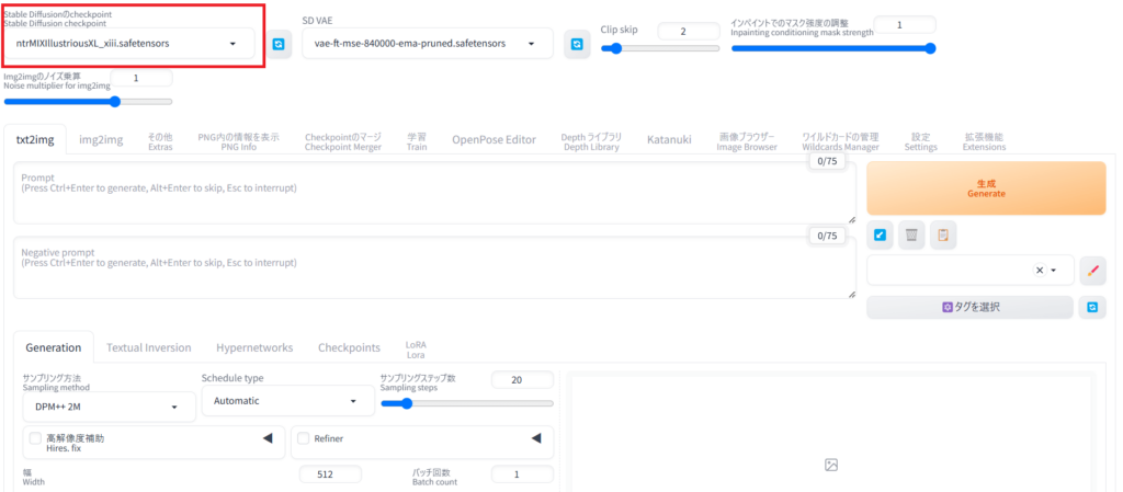 「Stable Diffusion‐Webui」→「models」→「Stable-Diffusion」で先ほどインストールしたNTR MIXを設置し、WebUIを起動します。後は、先ほどと同じ工程が画像を生成できます。