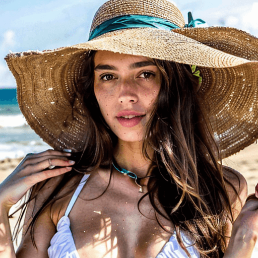 (Best quality :1.4 , masterpiece:1.3) , 8K , Best Photo , Super fine Photo , 1 girl , swimwear , wearing big hat , beach , detail eyes , long hair , blown hair , cute girl , upper body