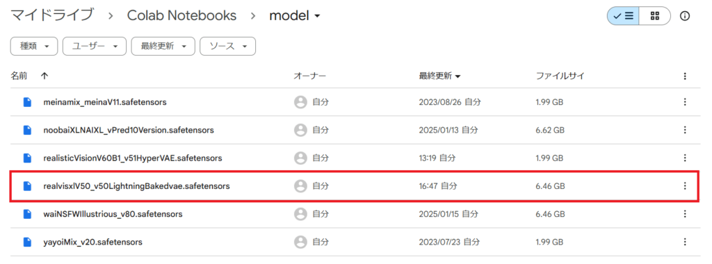 これで、Google ColabにRealVisXLのモデルをアップロードできました。
