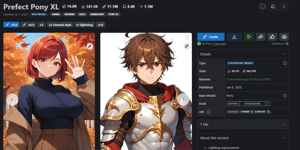 Prefect Ponyとは、Stable Diffusionで画像を生成する際に使用するアニメ系のモデルの1つになります。このモデルの特徴は、アニメやキャラクター性の高い画像を生成できる点です。最新のv5.0バージョンでは、照明の改善が施されており、より高品質な画像生成が可能になっています。