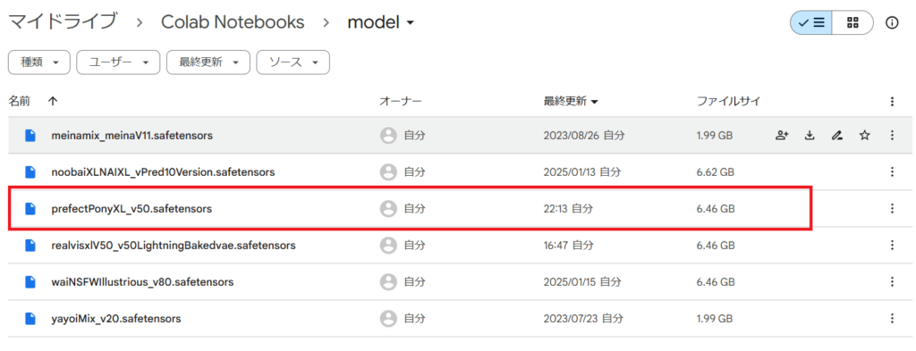 これで、Google ColabにPrefect Ponyのモデルをアップロードできました。