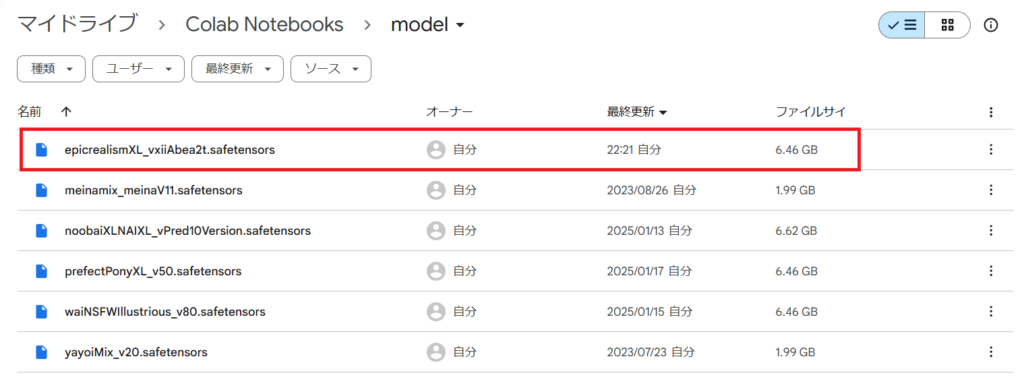 これで、Google ColabにepiCRealism XLのモデルをアップロードできました。