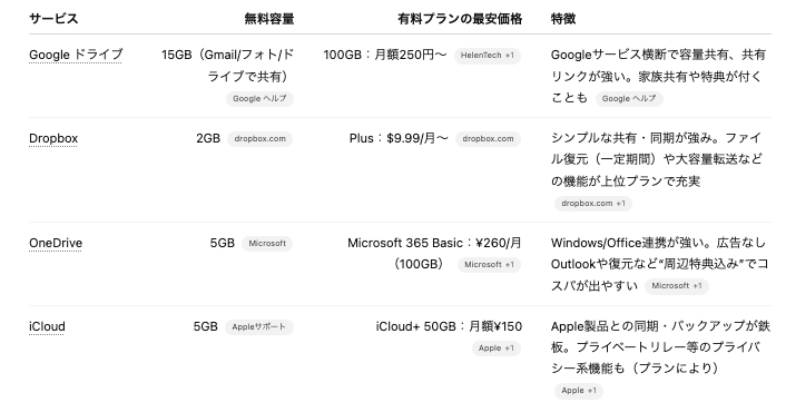「主要なクラウドストレージサービス(Googleドライブ、Dropbox、OneDrive、iCloud)を比較した表を作成してください。項目は無料容量、有料プランの最安価格、特徴としてください。」