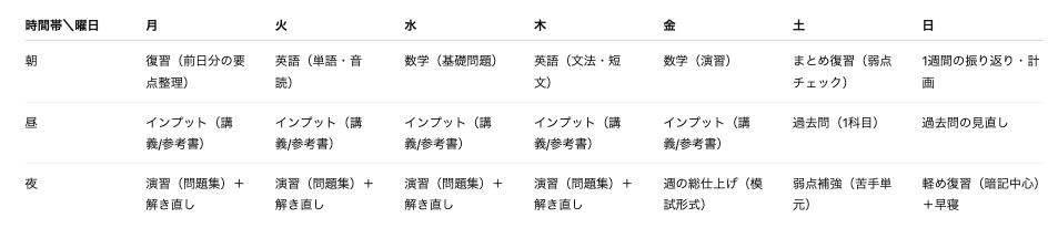 「1週間の勉強スケジュールを表形式で作成してください。列は曜日、行は朝・昼・夜の時間帯としてください。」