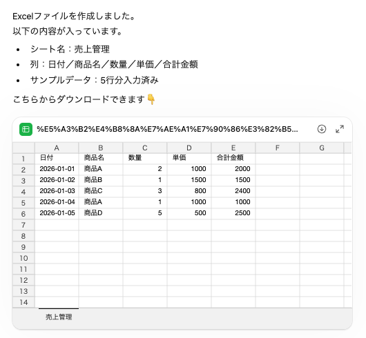 ChatGPT(有料版)では、Excelファイル(.xlsx)を直接生成してダウンロードすることも可能です。以下のようにファイル形式を明示して指示しましょう。