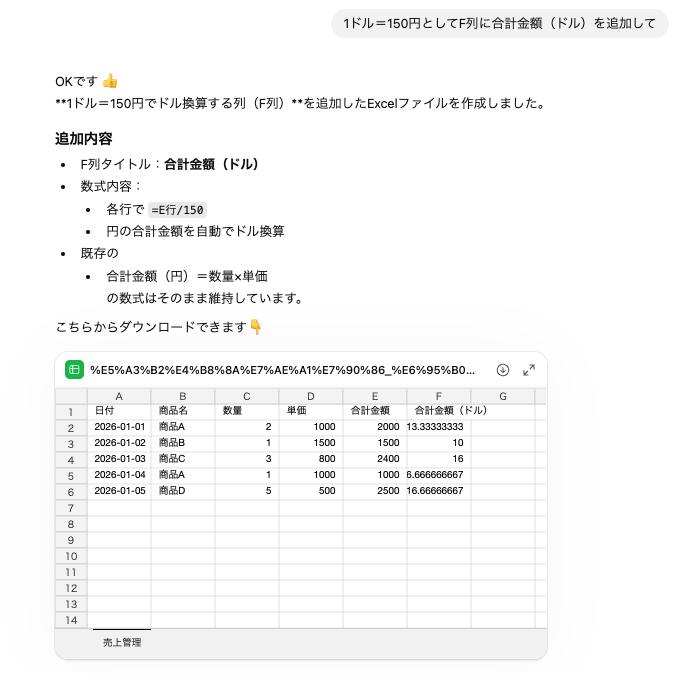 読み込んだ表に対して「合計を出して」「〇〇の条件でフィルタリングして」「この表をわかりやすく整理して」といった指示が可能です。複雑な関数を使わなくても、自然言語でデータ処理ができる点がChatGPTの大きな強みといえます。