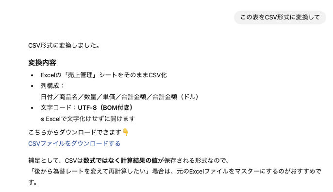 出力形式を変更したい場合も、ChatGPTに依頼するだけで対応できます。「この表をCSV形式に変換して」「HTML形式で出力して」と指示すれば、用途に合った形式で再出力してくれます。