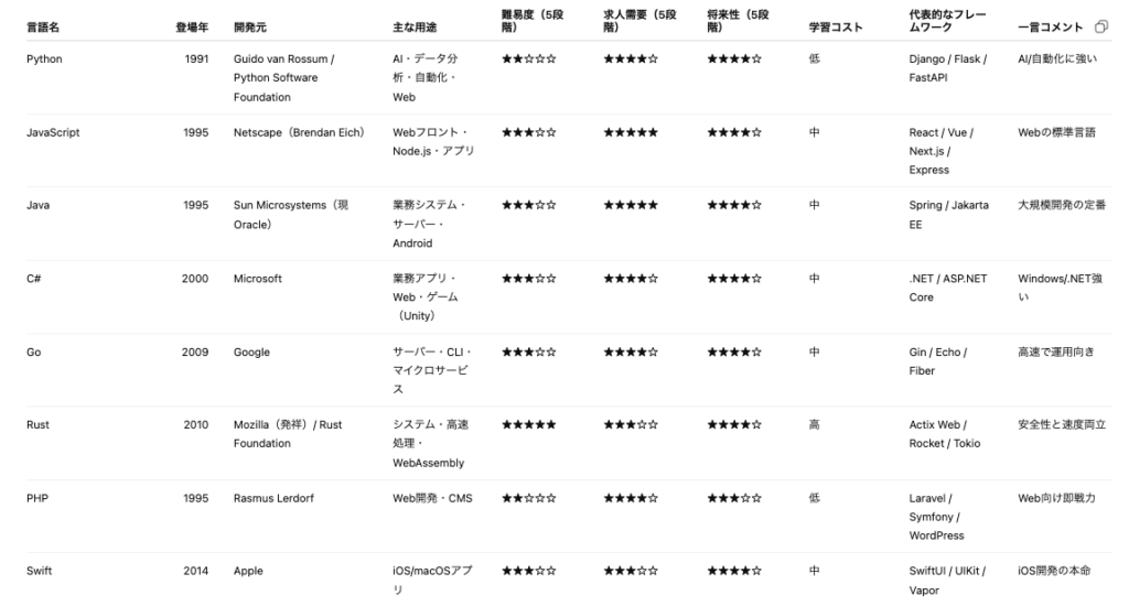 言語名、登場年、開発元、主な用途、難易度(5段階)、求人需要(5段階)、将来性(5段階)、学習コスト、代表的なフレームワーク、一言コメント