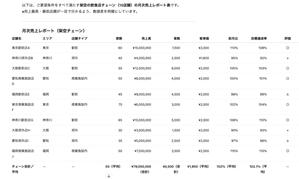 架空の飲食店チェーン(10店舗)の月次売上レポート表を作成してください。