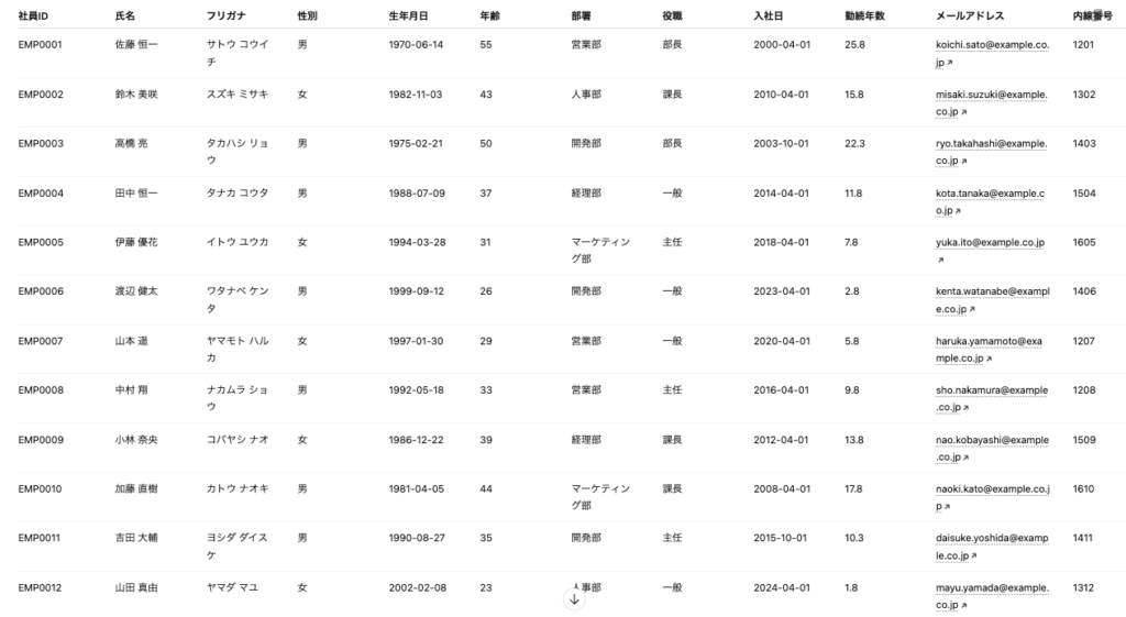 社員ID、氏名、フリガナ、性別、生年月日、年齢、部署、役職、入社日、勤続年数、メールアドレス、内線番号