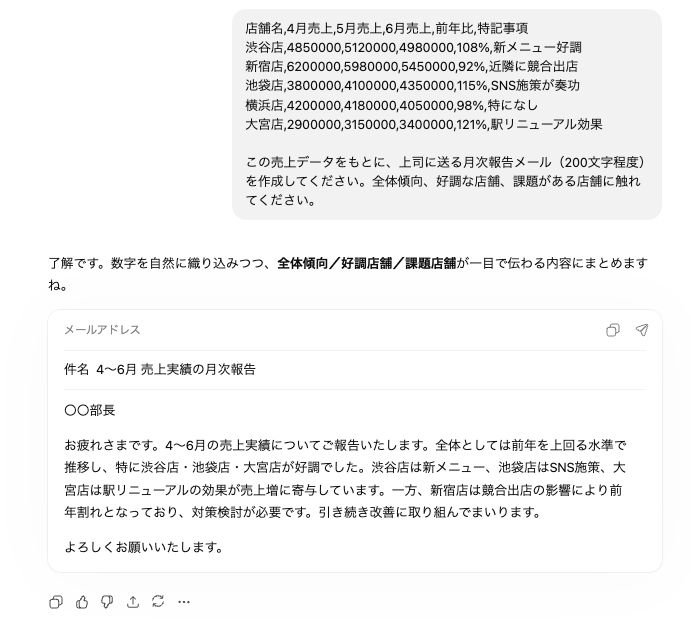 「この売上データをもとに、上司に送る月次報告メール(200文字程度)を作成してください。全体傾向、好調な店舗、課題がある店舗に触れてください。」