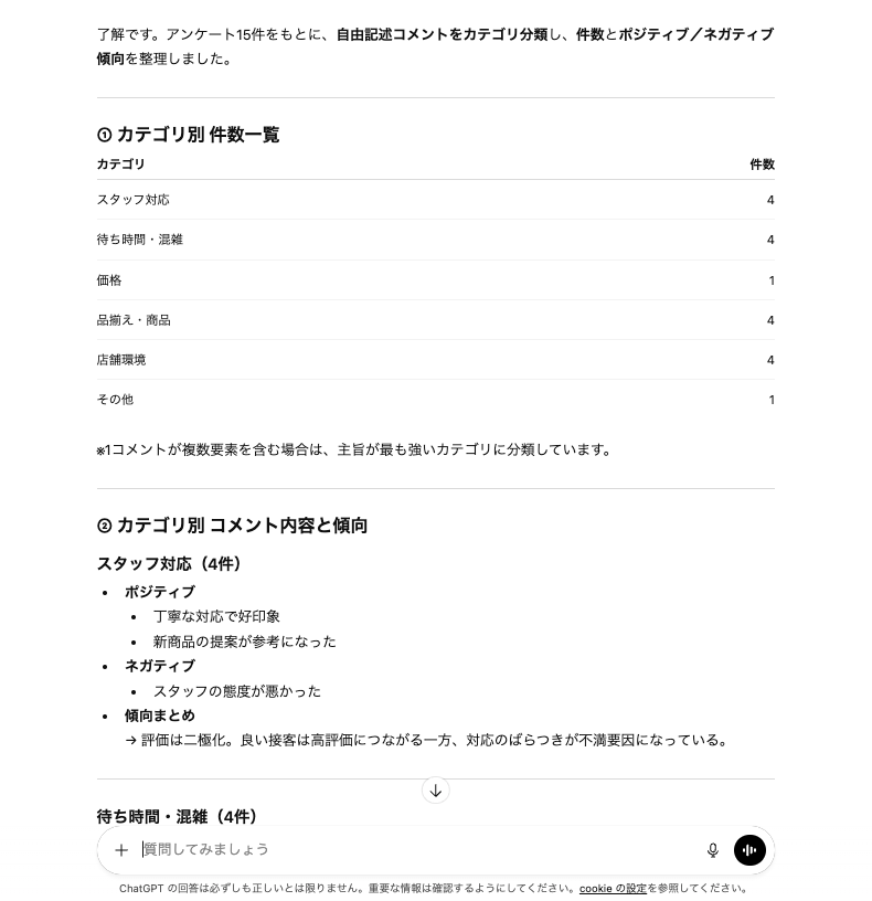 「このアンケート結果を分析してください。自由記述コメントを『スタッフ対応』『待ち時間・混雑』『価格』『品揃え・商品』『店舗環境』『その他』にカテゴリ分けし、カテゴリごとの件数と、ポジティブ・ネガティブの傾向をまとめてください。」