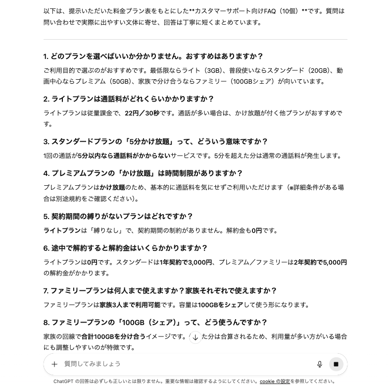 「この料金プラン表をもとに、カスタマーサポートで使えるFAQを10個作成してください。質問は実際にユーザーが問い合わせしそうな自然な文体で、回答は丁寧で簡潔にしてください。」