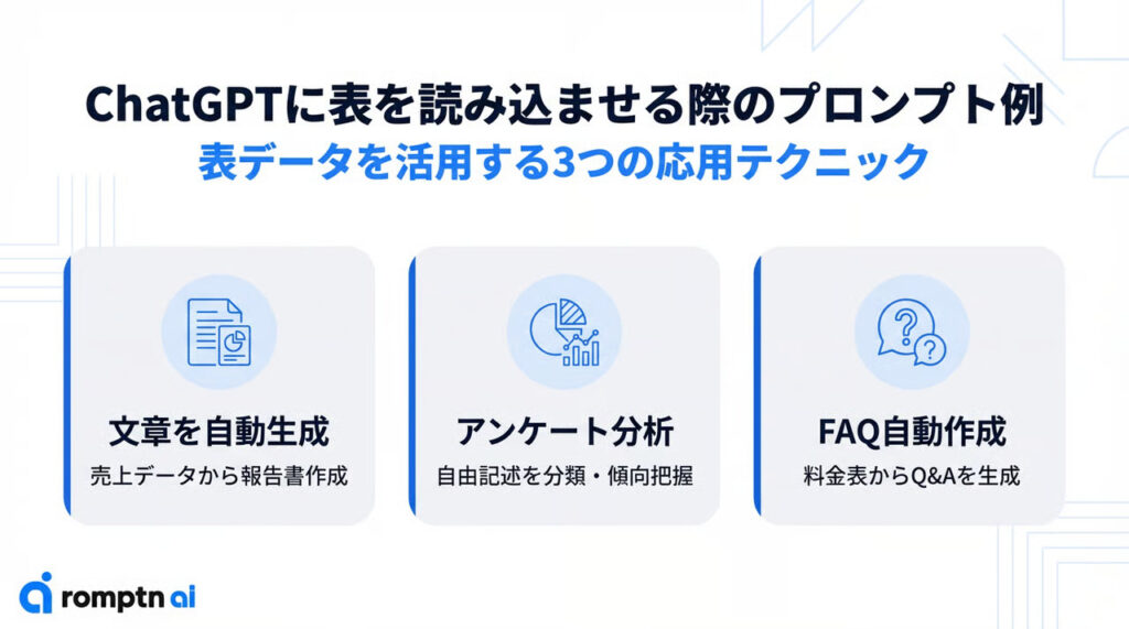 読み込んだ表データをもとに、報告書やメール文面を自動生成させる活用法です。数字の羅列を、人に伝わる文章に変換できます。