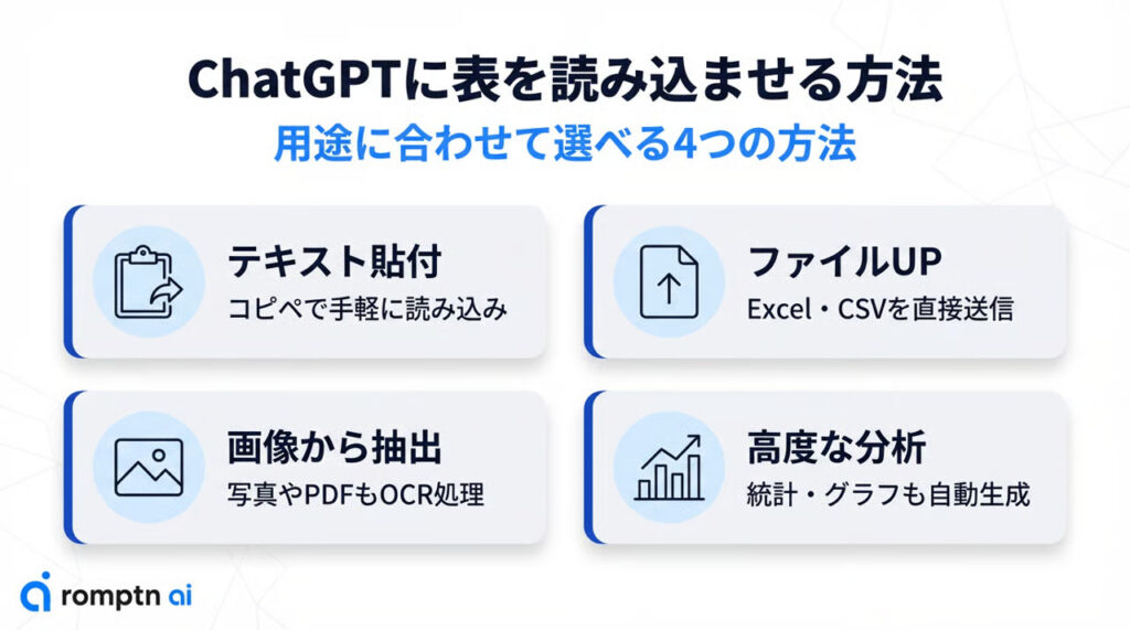 ChatGPTは表データの読み込みにも対応しています。用途やデータの形式に応じて、最適な方法を選びましょう。