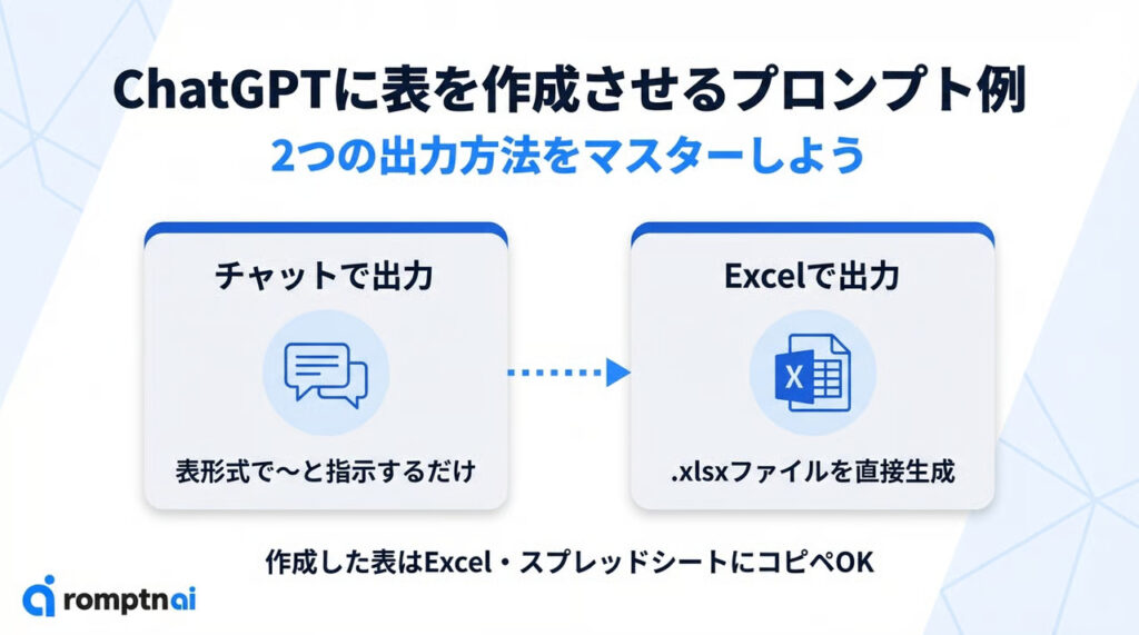 ChatGPTに表を作成してもらう方法は、大きく分けて2つあります。チャット上でテキストとして出力する方法と、Excelファイルとして直接出力する方法です。それぞれの具体的なプロンプト例を紹介します。
