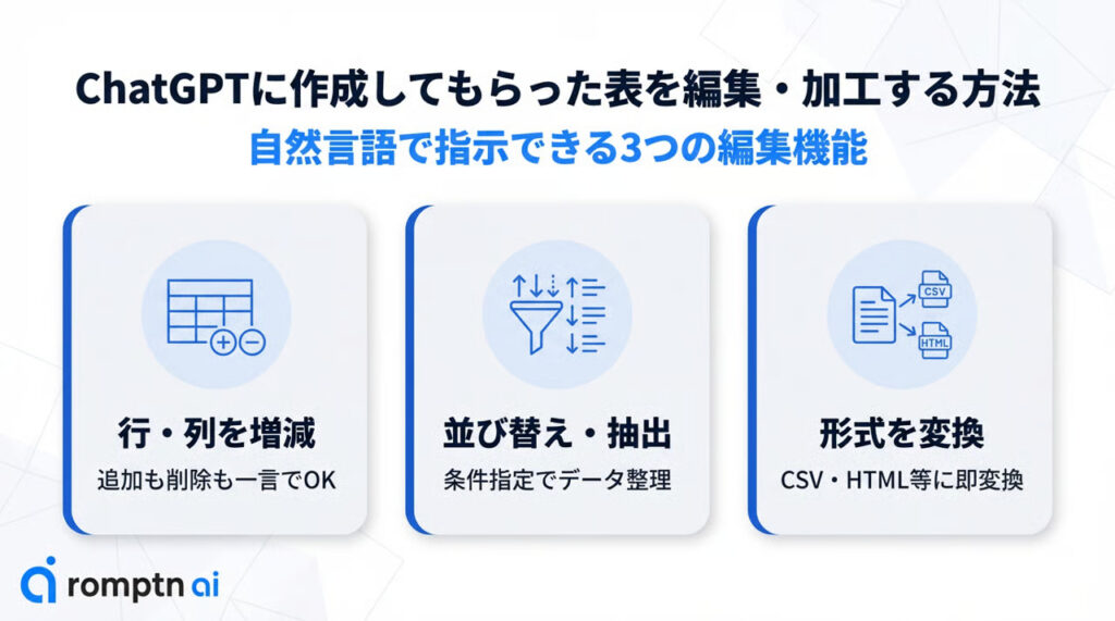 ChatGPTは表の作成だけでなく、既存の表を編集・加工することも得意です。自然言語で指示するだけで、面倒なデータ整理を効率化できます。