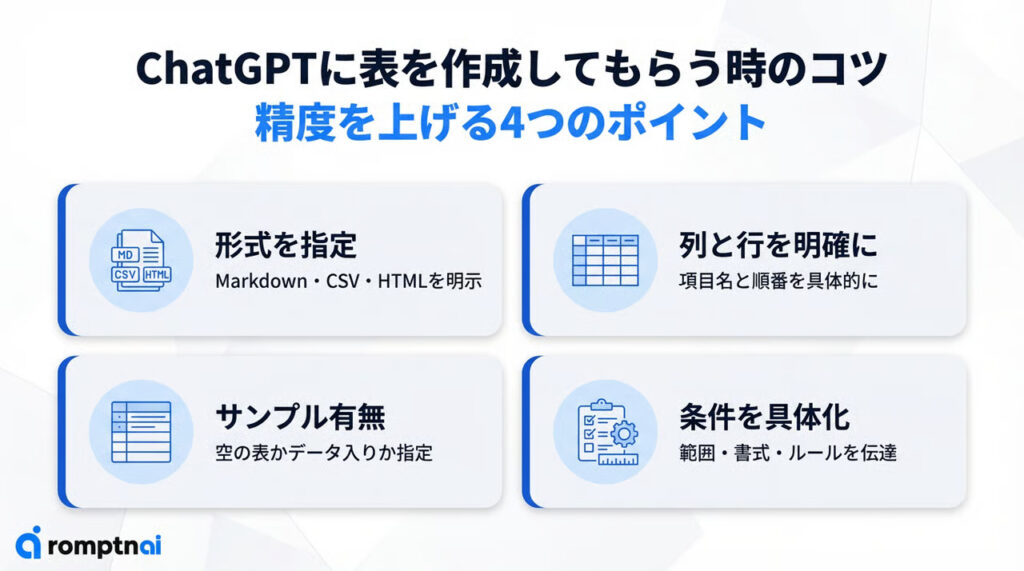 ChatGPTに表を作成させる際、漠然と指示するだけでは期待通りの結果が得られないことがあります。以下のポイントを押さえることで、より精度の高い表を作成できます。