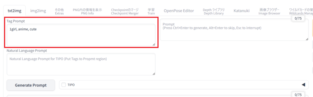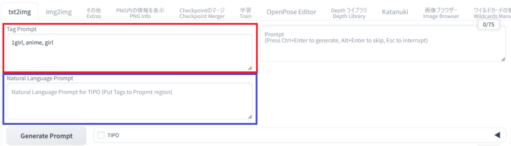 TIPOのインターフェースは「tag prompt」と「Natural language prompt」の2つの入力欄があります。