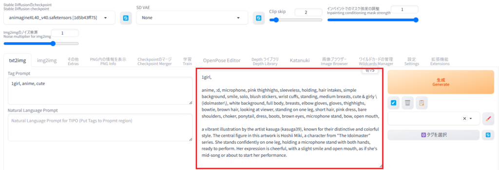 - tag prompt: SD1.5やSDXLで使うタグ形式のプロンプトを入力