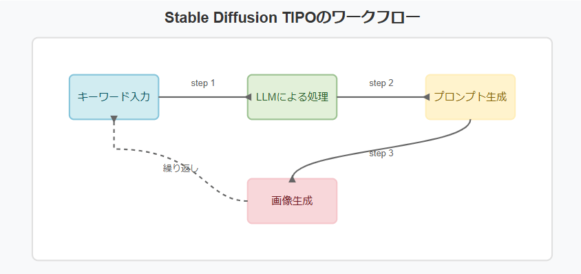 通常のStable Diffusionでは詳細なプロンプトを自分で考える必要がありますが、TIPOを使えば簡単なキーワードを入力するだけで、AIが適切なプロンプトを提案してくれます。
