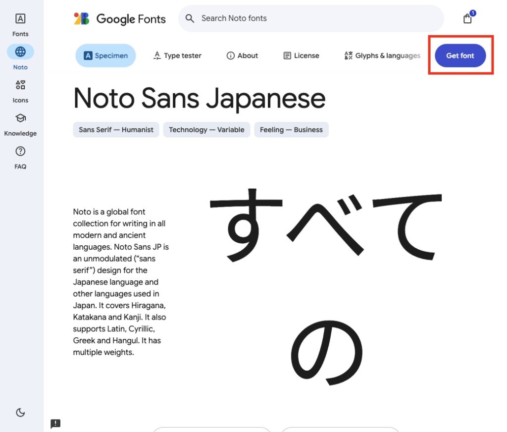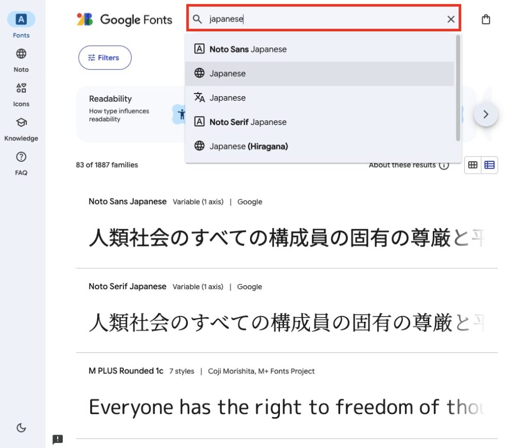 Google Fontsにアクセスし、検索ボックスに「Japanese」と入力して日本語フォントを検索します。