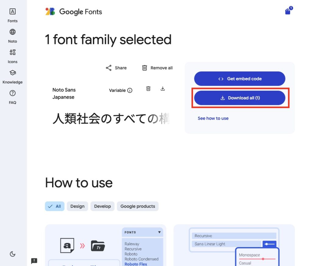 気に入ったフォントを選び、「Get font」→「Download all」でttfファイル(.ttf形式)をダウンロードします。