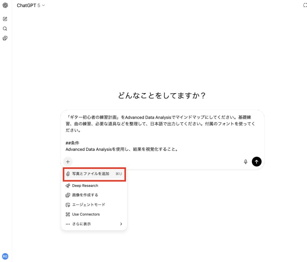 ChatGPTのチャット画面を開き、メッセージ入力欄の左側にある「+」ボタン(クリップマーク)をクリックします。