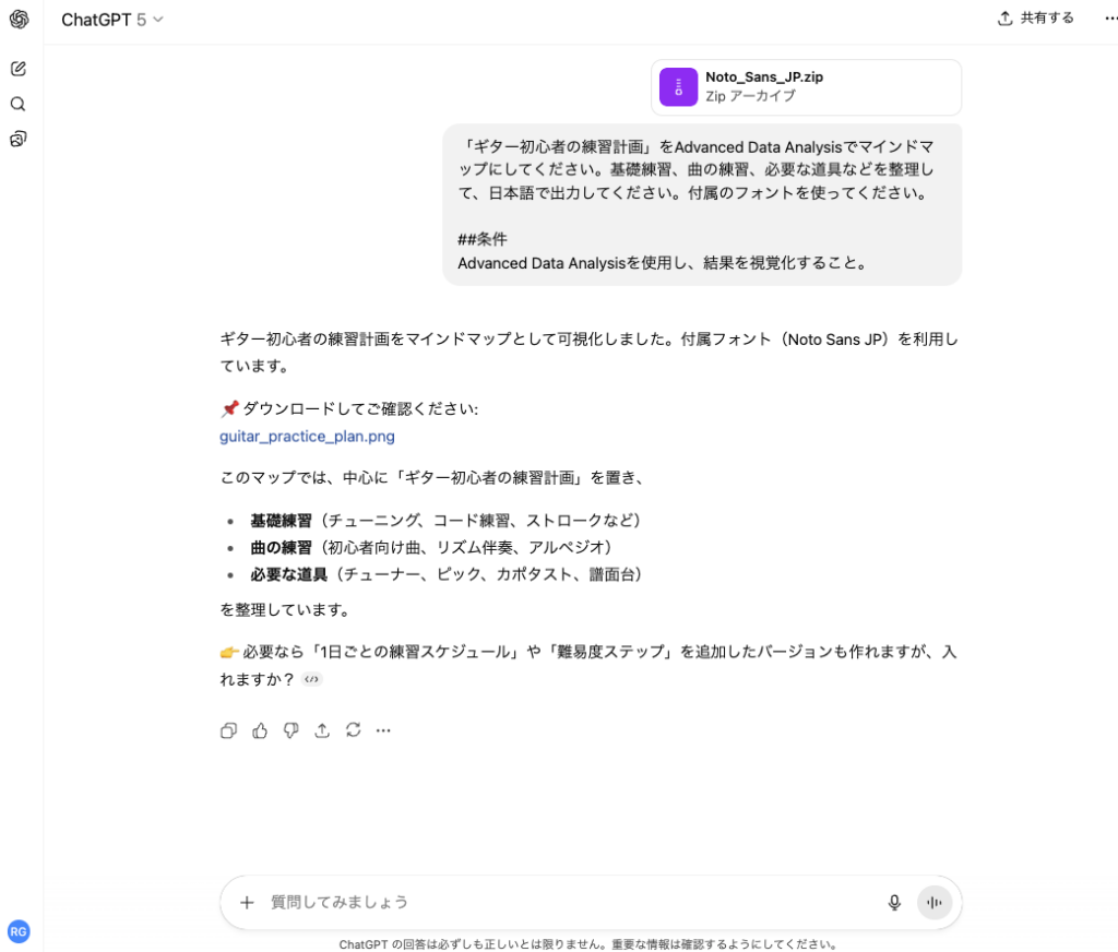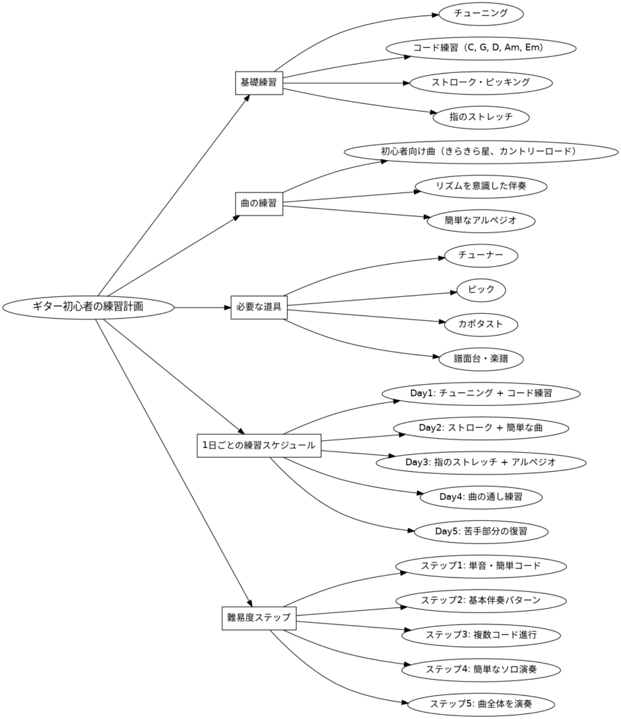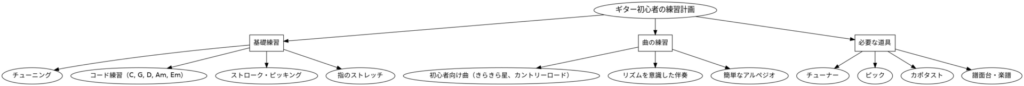 「ギター初心者の練習計画」をAdvanced Data Analysisでマインドマップにしてください。基礎練習、曲の練習、必要な道具などを整理して、日本語で出力してください。付属のフォントを使ってください。