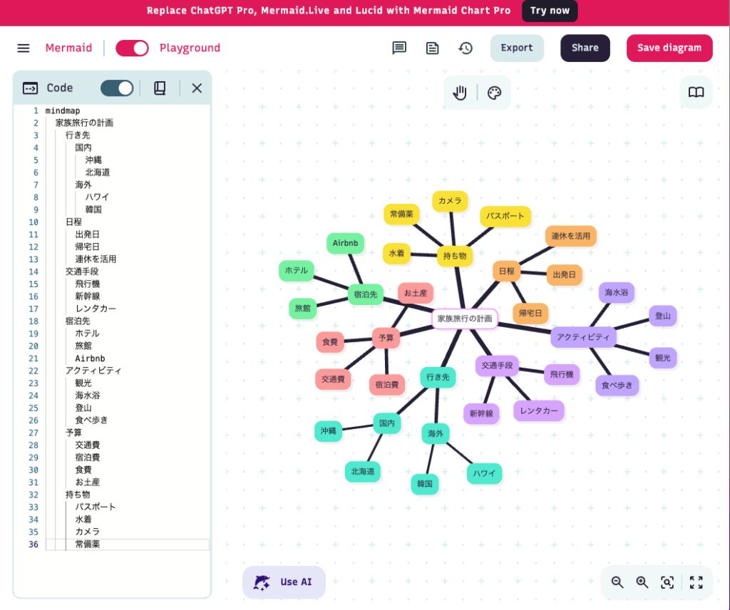 今回は、「Mermaid Chart: diagrams and charts」を利用してマインドマップを作成していきます。