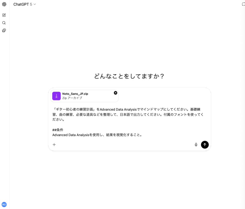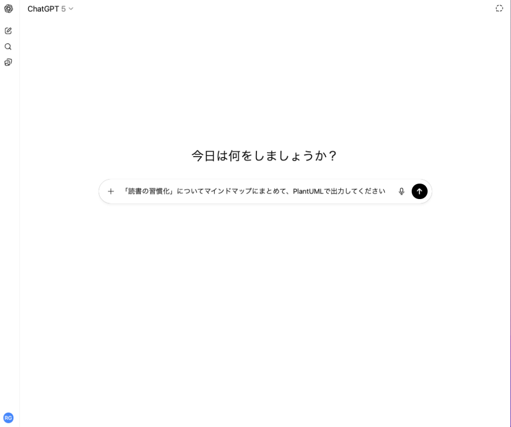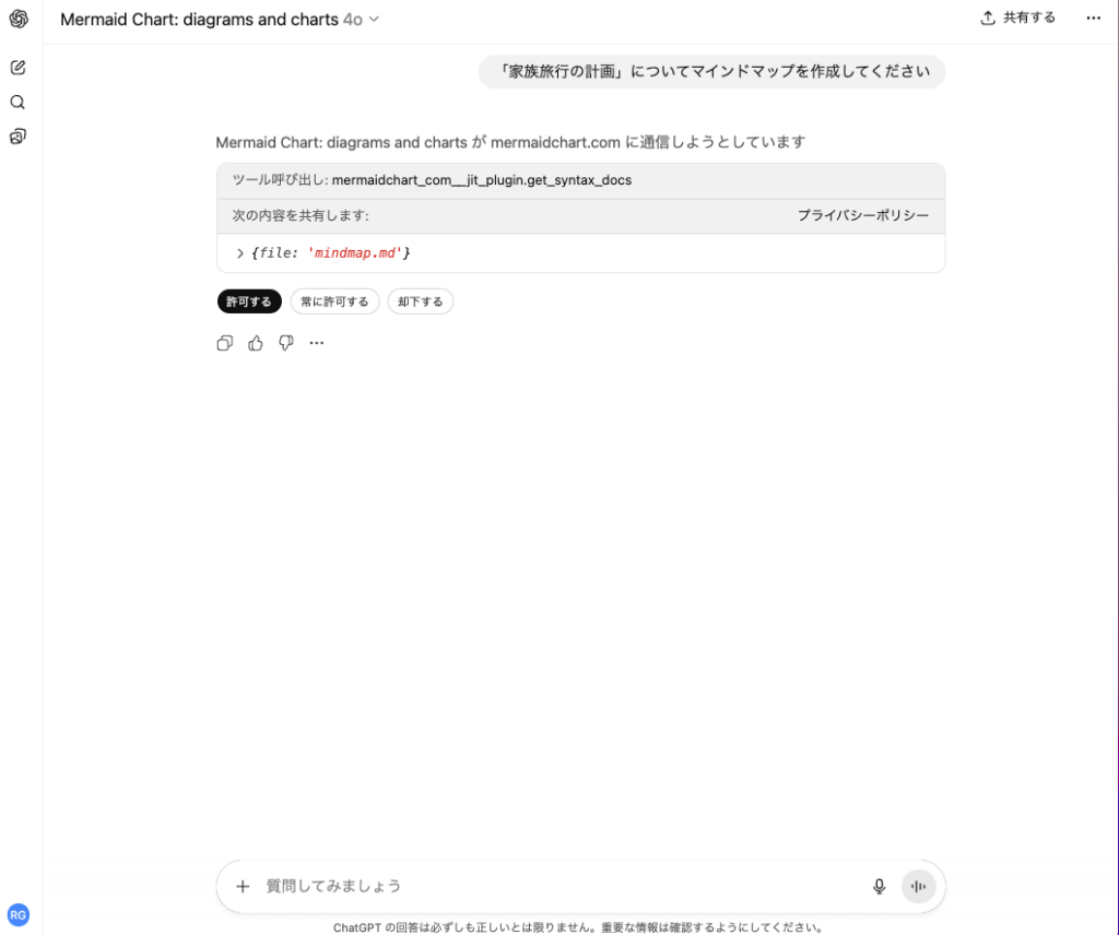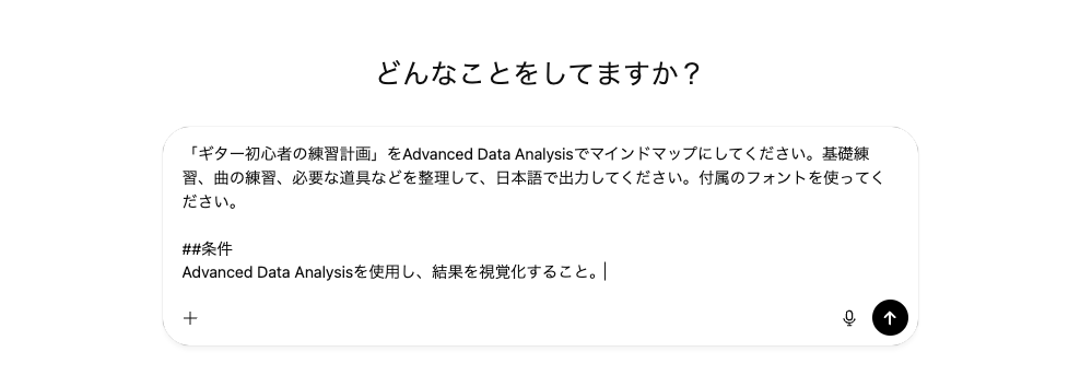 通常のチャット同様に、作成したいマインドマップのプロンプトをChatGPTに入力します。