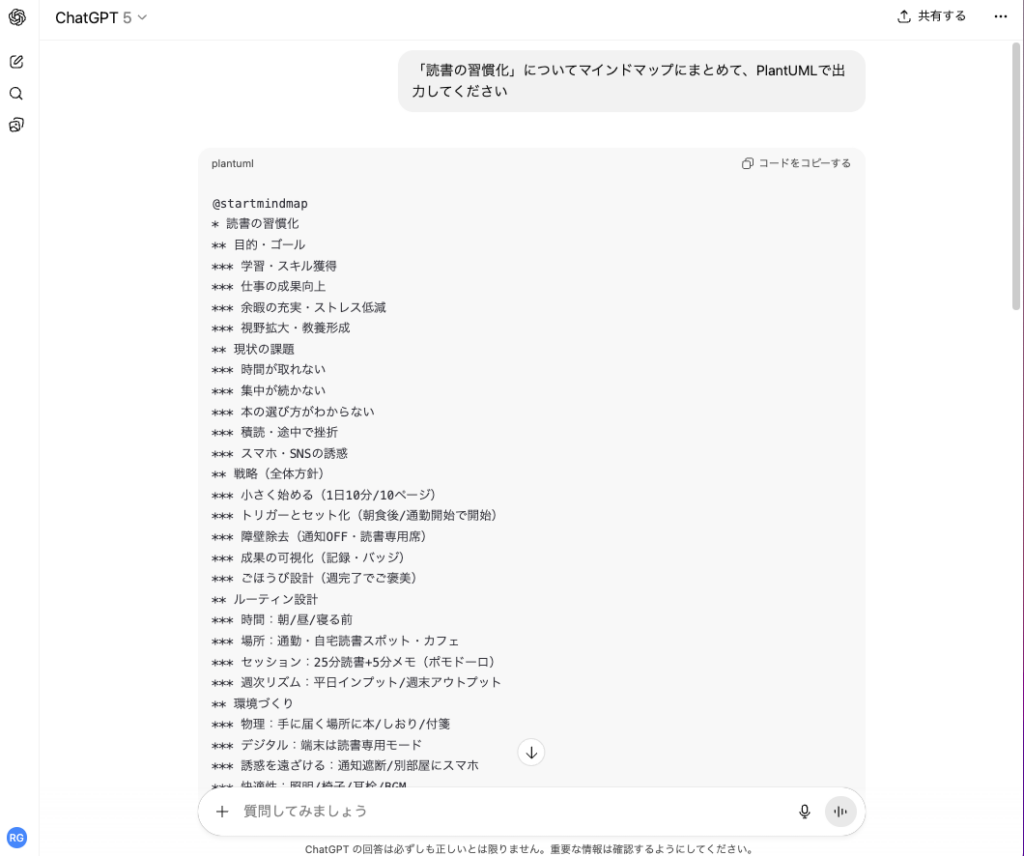 ChatGPTが@startmindmapから@endmindmapまでのコードを出力します。この部分をすべてコピーしてください。