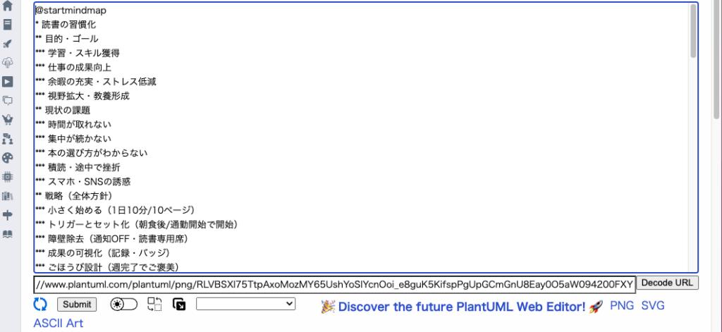 「読書の習慣化」についてマインドマップにまとめて、PlantUMLで出力してください