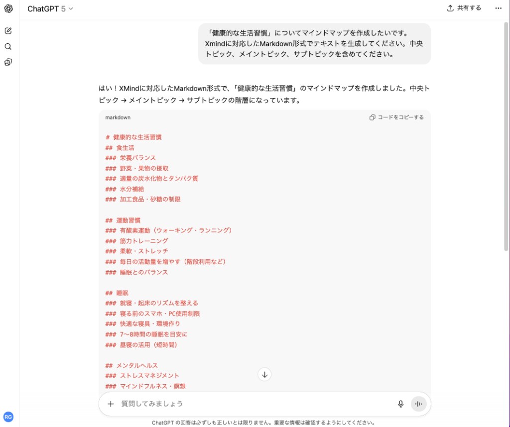 - Markdown形式:「Xmind対応のMarkdown形式で出力してください」