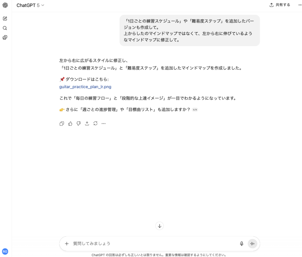 「〇〇の要素を削除して」「△△のブランチをもっと詳しく展開して」「色を変更して」など、具体的な修正指示を会話形式で伝えるだけで、ChatGPTが即座に反映した新しい画像を生成してくれます。