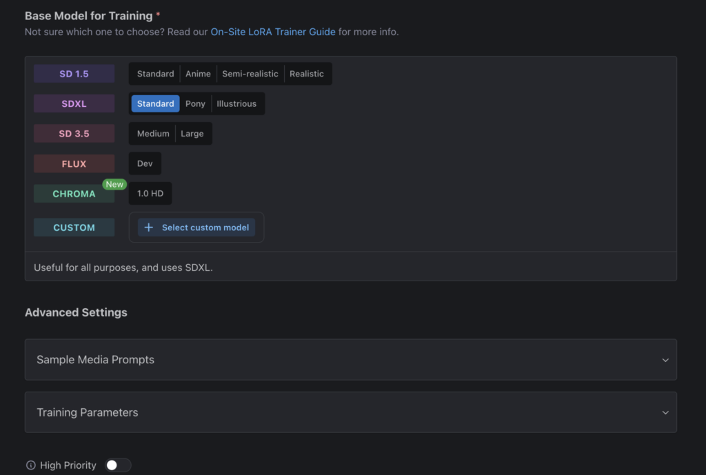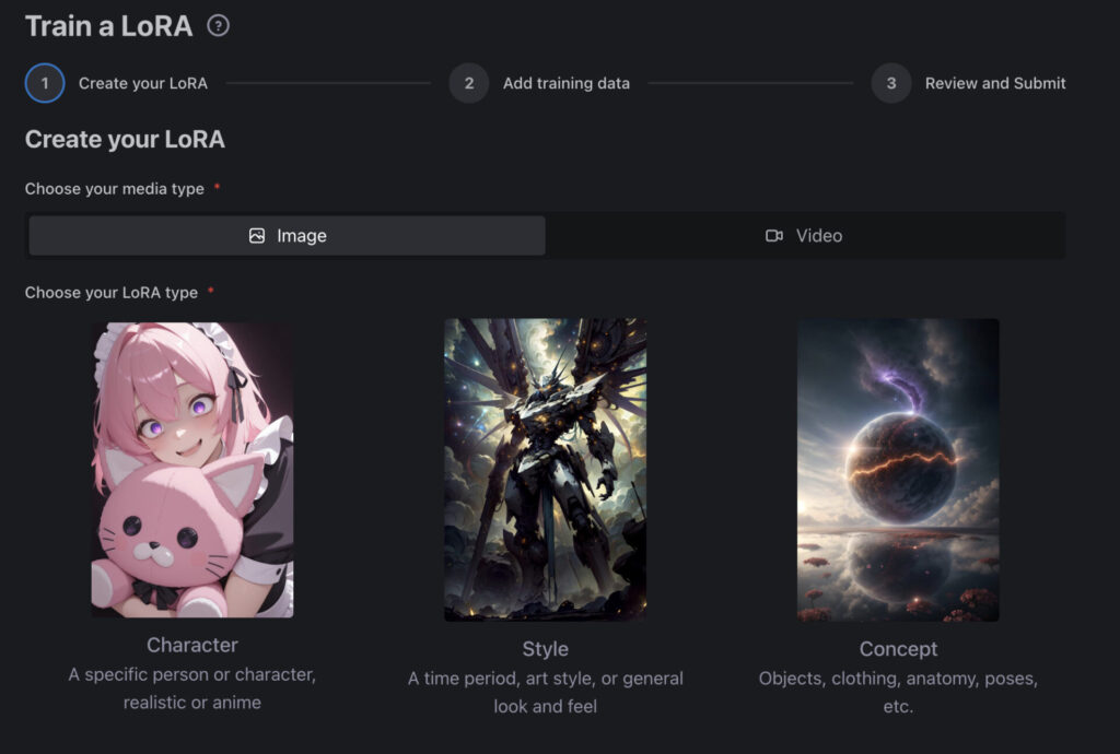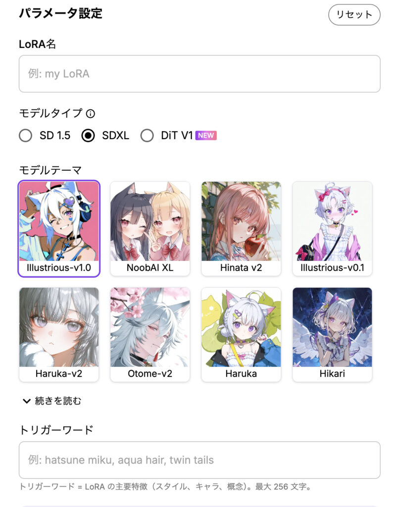 - LoRAタイプ: アニメキャラ/リアルキャラ/アートスタイル/風景から選択