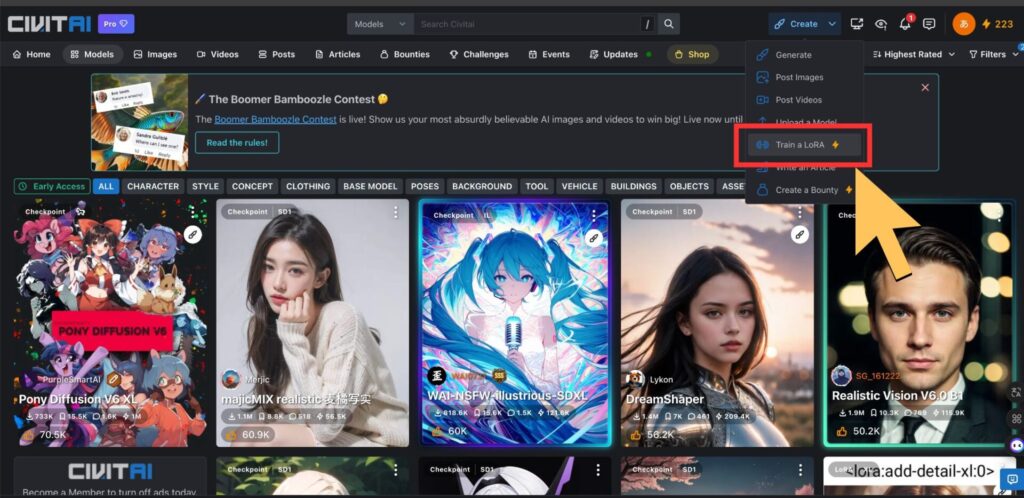 Civitai.comはAIモデルの配布サイトとして有名ですが、LoRA作成機能も提供しています。