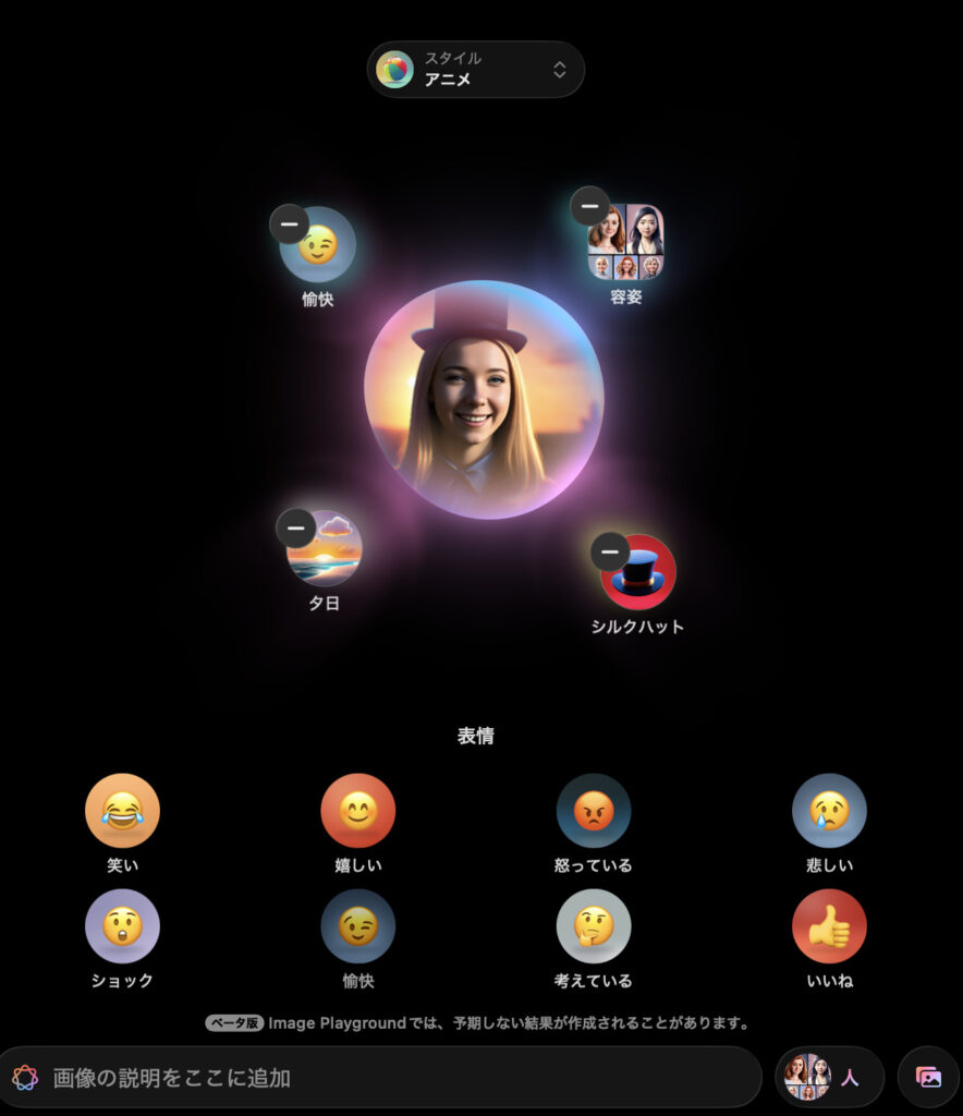 Image Playgroundは、Apple純正の画像生成アプリです。アニメーション、イラスト、スケッチの3種類のスタイルで画像を生成できます。