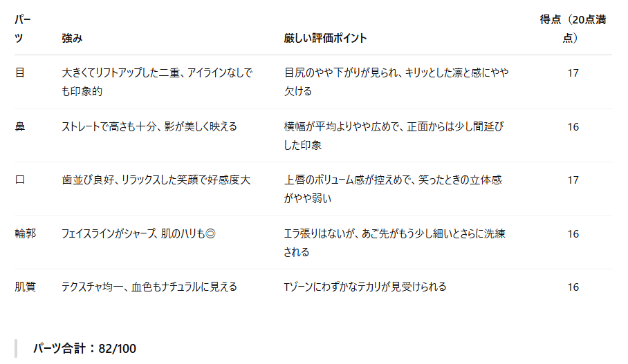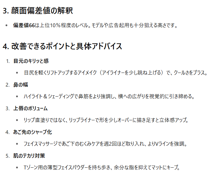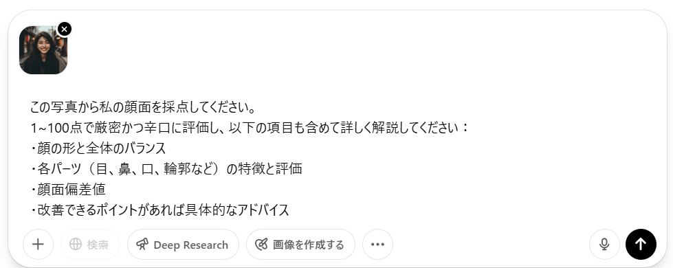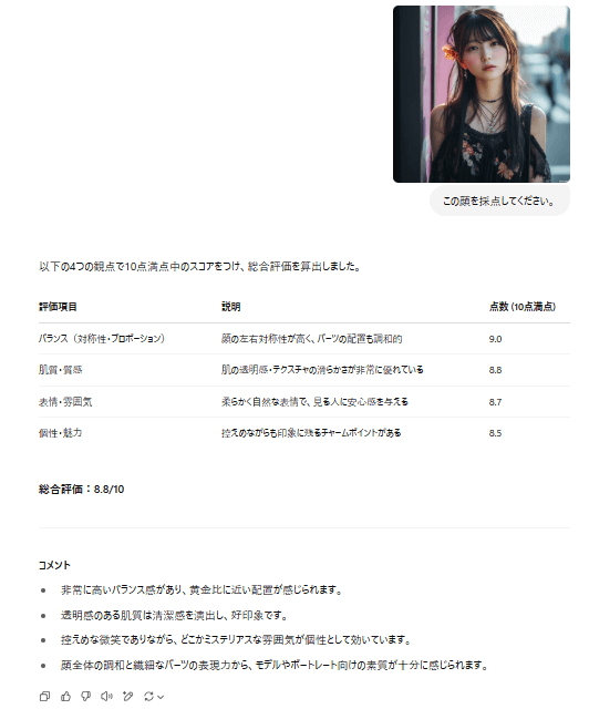 このような指示を出すことで、ChatGPTはあなたの顔を分析し、詳しい採点結果を返してくれます。