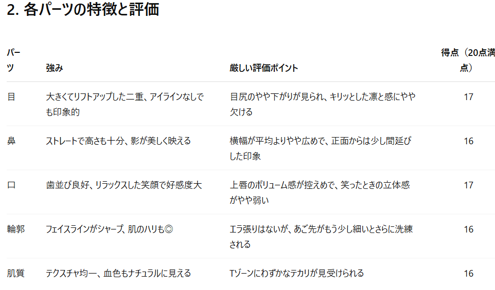 ・各パーツ(目、鼻、口、輪郭など)の特徴と評価