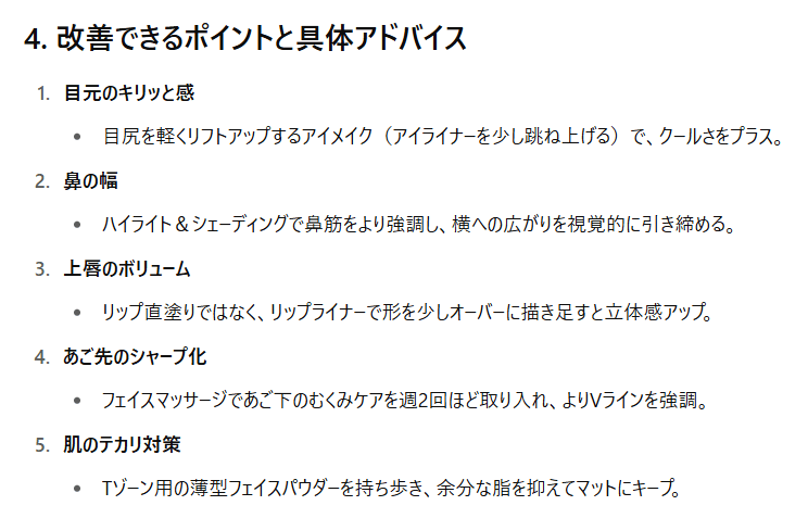 「髪型を少し変えると、顔の形をより活かせるでしょう」「眉毛の形を整えると、目の魅力がさらに引き立ちます」といった実践的なアドバイスは参考になりますね。
