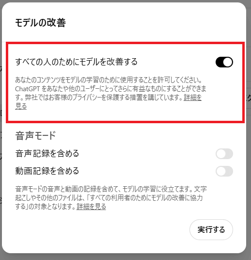 - プライバシーが心配な方は「モデルを改善する」設定をオフにするのがおすすめ