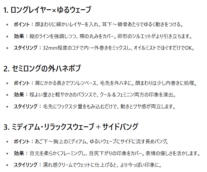 ChatGPTに「この顔に似合う髪型を教えて」と頼むと、あなたの顔の形や特徴に合った具体的な髪型を提案してくれます。美容院に行く前のシミュレーションとして活用できます。